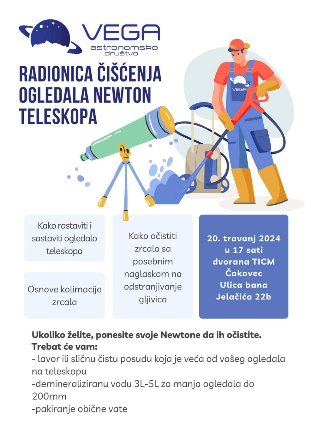 Astronomsko društvo VEGA, u subotu, 20. travnja 2024. godine, u prostorima TICM-a organizira besplatnu Radionicu čišćenja ogledala Newton teleskopa. Više informacija nalazi se na plakatu u nastavku.