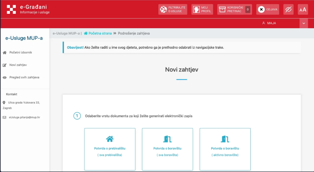 Kako biste došli do elektroničkih zapisa (uvjerenja) iz službenih evidencija odabranih ministarstava ili nadležnih institucija, na ovom primjeru e-usluga MUP-a, odaberite Novi zahtjev te zatim vrstu dokumenta za koji želite generirati elektronički zapis.
