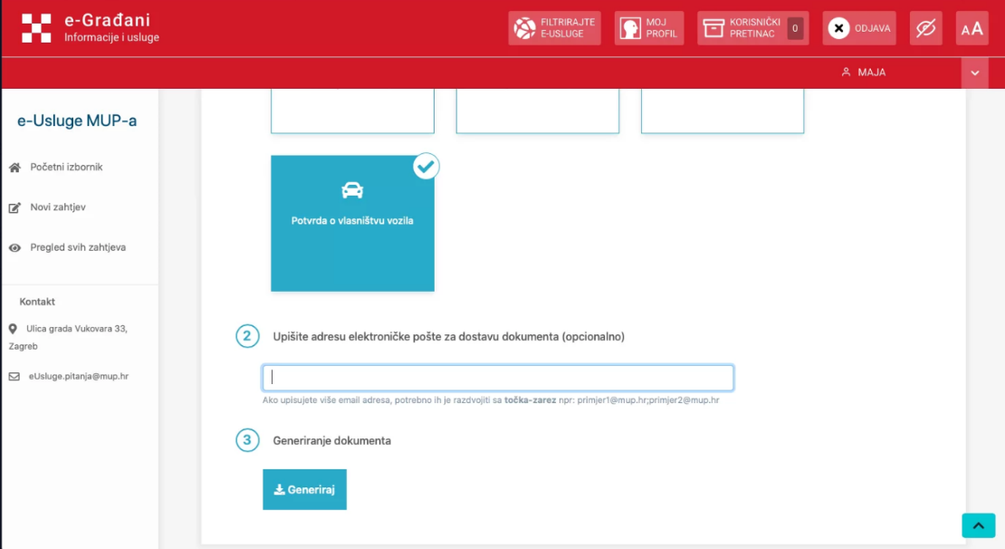 Zatim unesite e-mail adresu kojoj imate pristup te potvrdite predaju zahtjeva pritiskom na gumb Generiraj. Ako želite da se dokument generira te preuzme lokalno na vaše računalo ili uređaj s kojeg predajete zahtjev, nije potreban unos e-mail adrese.