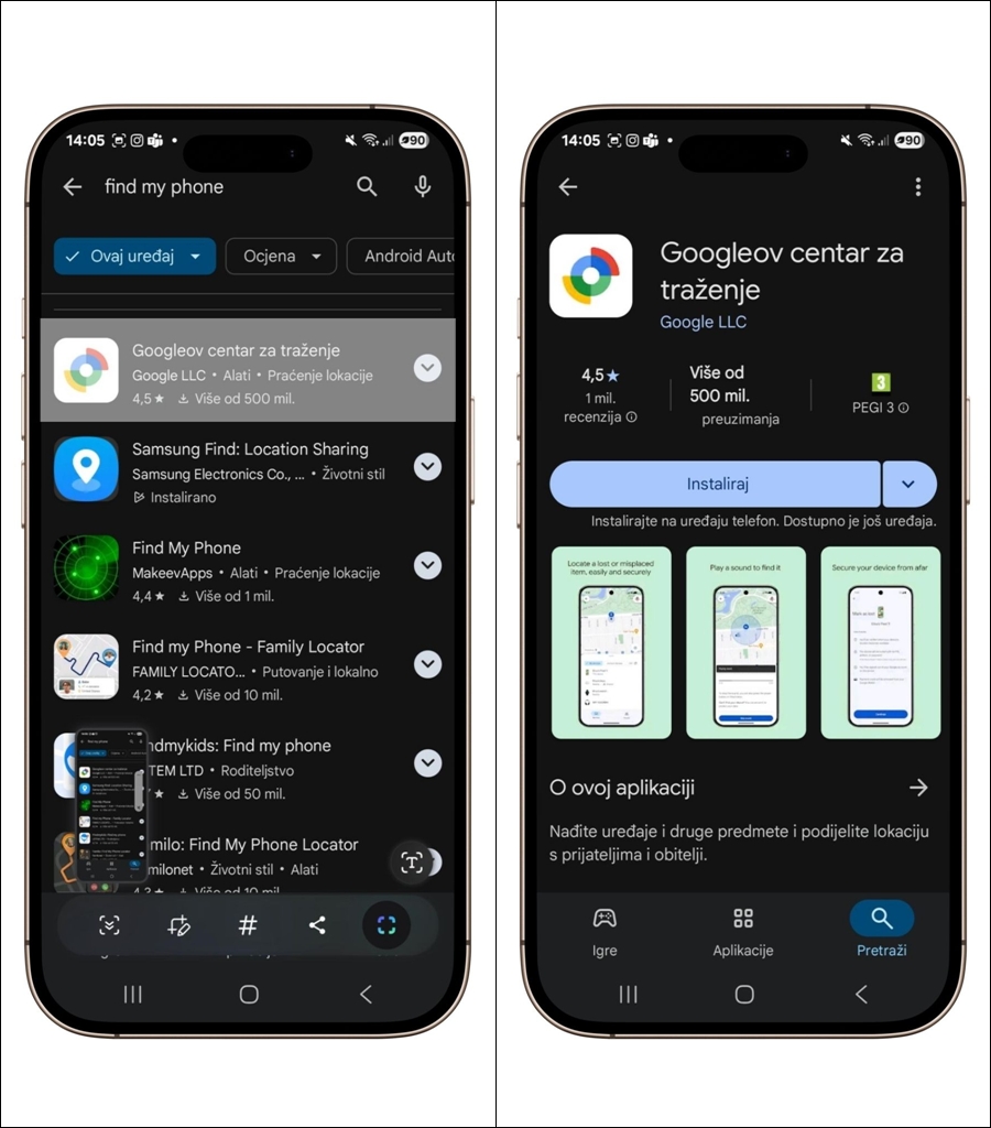 Find My Phone (Find My Device na Androidu) je besplatna Googleova aplikacija koja pomaže pronaći izgubljeni ili ukradeni mobitel. Omogućuje lociranje uređaja na karti, puštanje zvuka, zaključavanje uređaja ili brisanje podataka na daljinu.