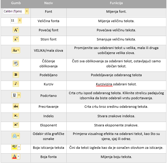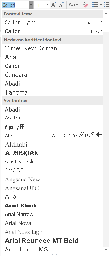 Za brzu izmjenu osnovnih značajki pisma dostupne su naredbe iz skupine Font na kartici Polazno. Neki gumbi sadrže dva dijela: desni dio sa strelicom otvara izbornik s dodatnim mogućnostima oblikovanja, dok lijevi dio prikazuje trenutno odabranu opciju.