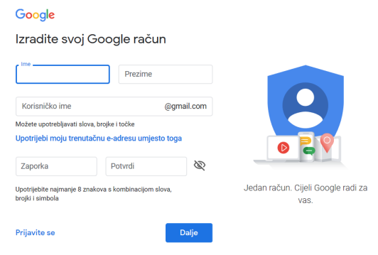 Izrada Gmail računa.