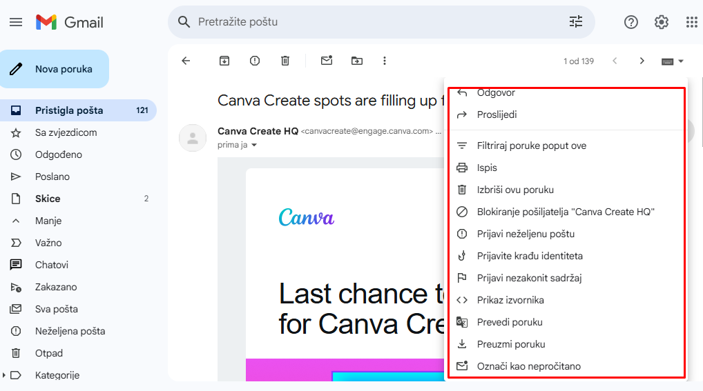 Opcije pristigle pošte.