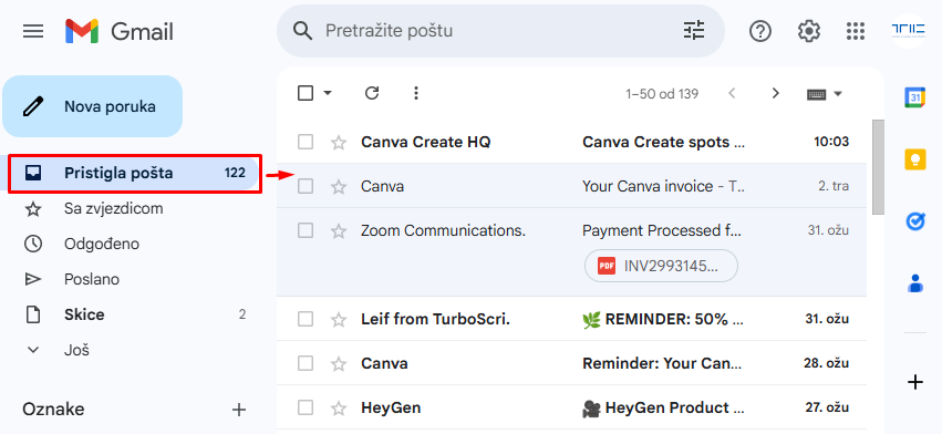 Pristigla pošta (Inbox) u Gmailu