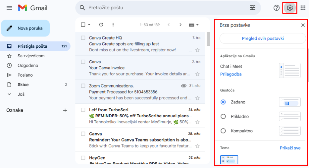 Promjena postavki u Gmailu