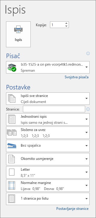 Word sadrži mnogobrojne mogućnosti ispisa. Primjerice, možete ispisati samo jednu stranicu, nekoliko njih, parne i neparne stranice itd.