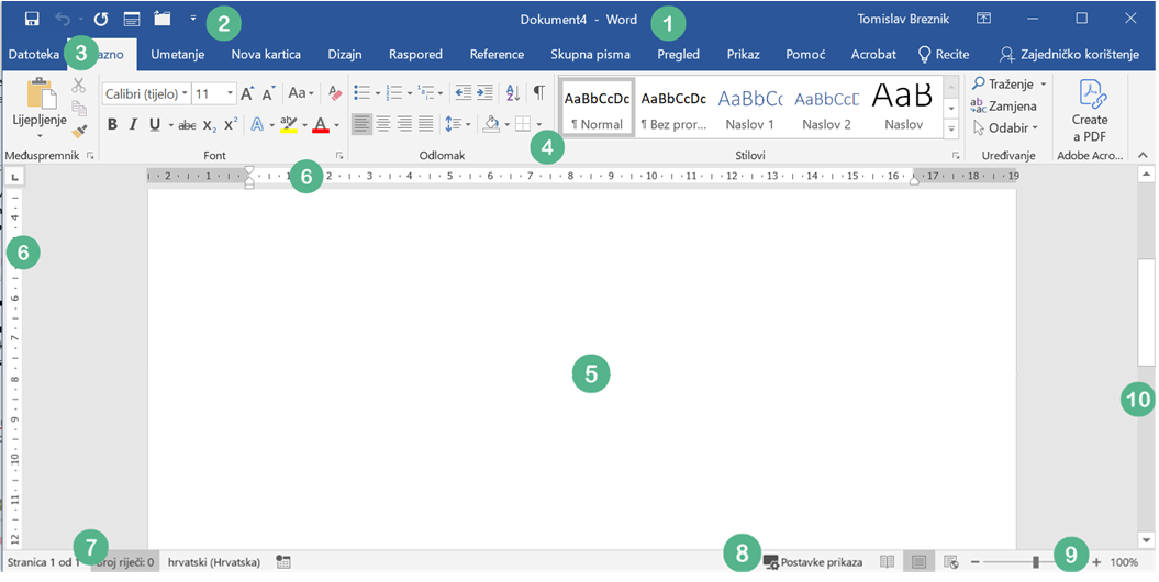 U naslovnoj traci (broj 1) prikazuje se naziv otvorenoga dokumenta i ime programa. U lijevome dijelu naslovne trake nalazi se alatna traka za brzi pristup (broj 2) često korištenim naredbama koja se može prilagođavati našim potrebama. U desnome su kutu gumbi za promjenu veličine prozora, kao i gumb za zatvaranje programa Word.