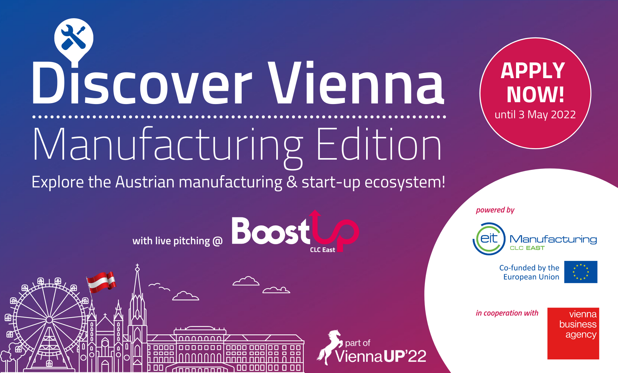 Nakon uspjeha prvog izdanja programa Discover Vienna: Manufacturing Edition u studenom 2021., EIT Manufacturing CLC East ponovno se udružuje s Vienna Business Agency kako bi i po drugi put organizirao Discover Vienna: Manufacturing Edition, ovaj put tijekom ViennaUP’22 festivala – najvećeg decentraliziranoga start-up festivala u srednjoj Europi.