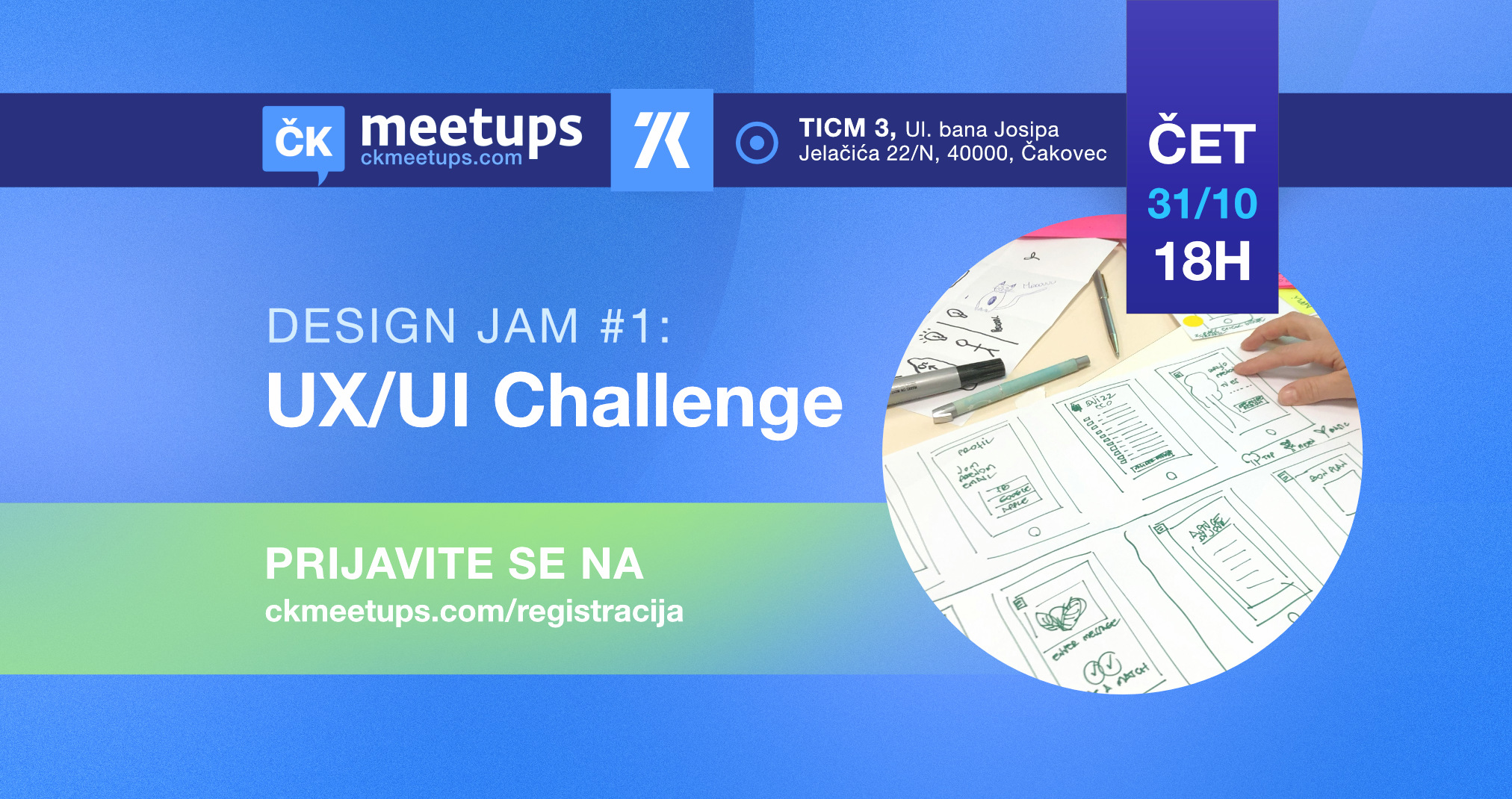 Design Jam #1 – UX/UI Challenge zamišljen je kao interaktivna radionica kroz koju se kandidati podijele u nasumične timove i zajedno rješavaju postavljeni problemski zadatak. Nakon isteka vremena, rješenje prezentiraju pred ostalim sudionicima. Svi koji sudjeluju na kraju glasaju za najbolje rješenje nakon čega se proglašava pobjednik. Cilj ovakvog događaja je upoznavanje drugih dizajnera, povezivanje, učenje na konkretnim primjerima i dijeljenje znanja.