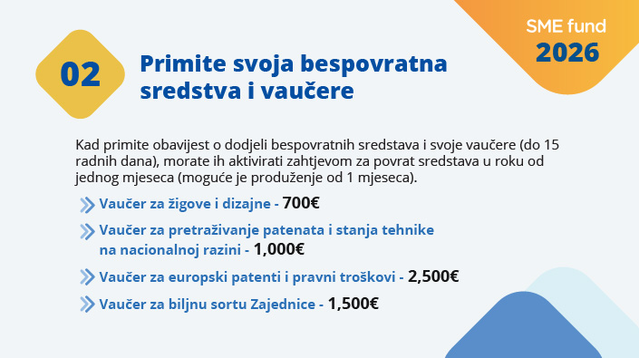 - Vaučer 2. – za troškove registracije žiga i industrijskog dizajna putem nacionalnih, regionalnih, europskih i međunarodnih sustava zaštite – 75 % povrata troškova;