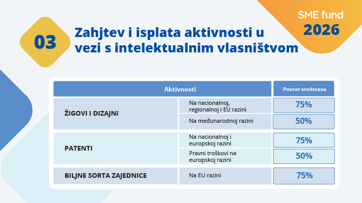 - Vaučer 3. – za troškove prijave patenta na nacionalnoj ili regionalnoj razini, usluge pretraživanje stanja tehnike te troškove pravnog zastupanja za sastavljanje i podnošenje prijave europskog patenta (samo za zastupnike u Registru Europskog patentnog ureda – EPO-a) – 75 % povrata troškova;
